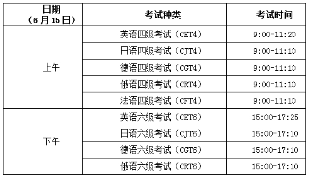 英语四级口语考试(CET-SET4)考试时间为5月25日,英语六级口语考试(CET-SET6)考试时间为5月26日,具体场次安排如下: