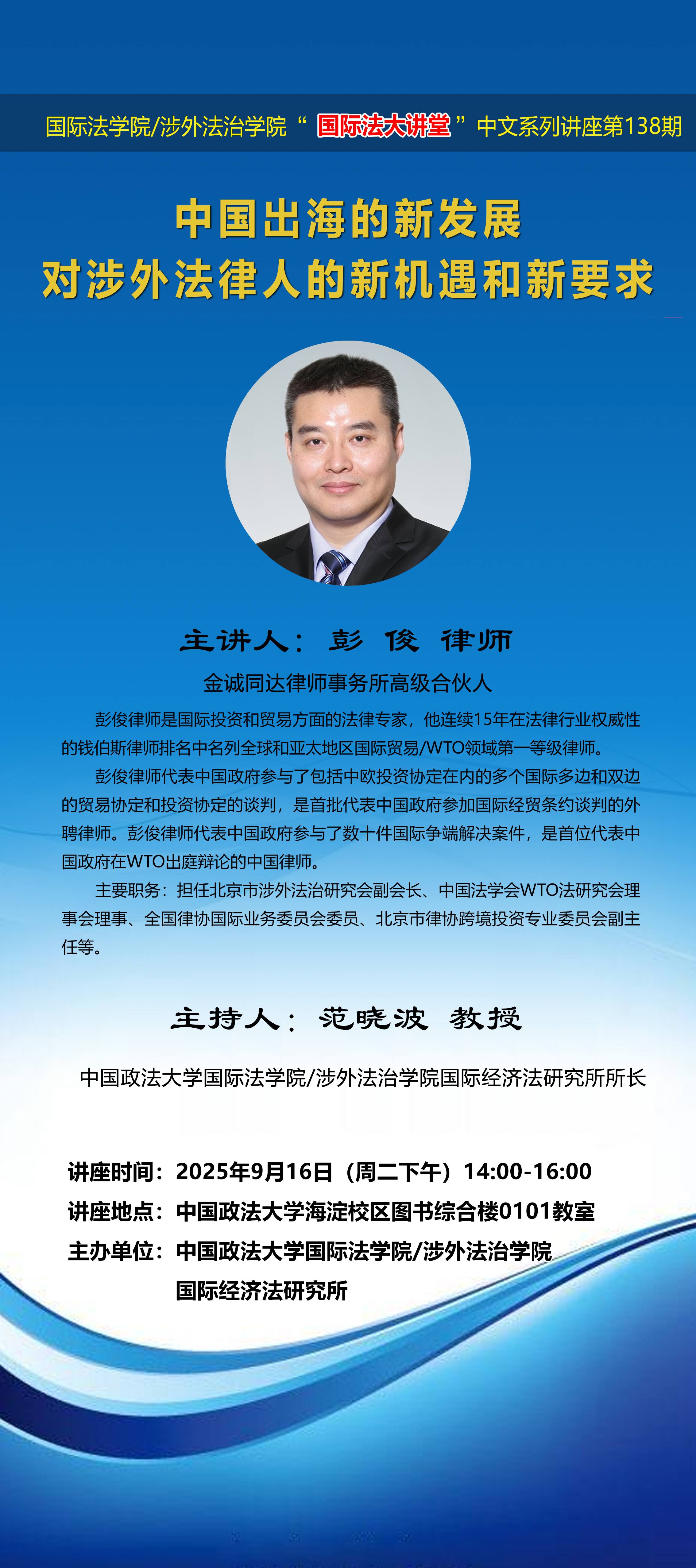 现将《中国出海的新发展对涉外法律人的新机遇和新要求》讲座信息通知如下,欢迎感兴趣的师生积极参加: