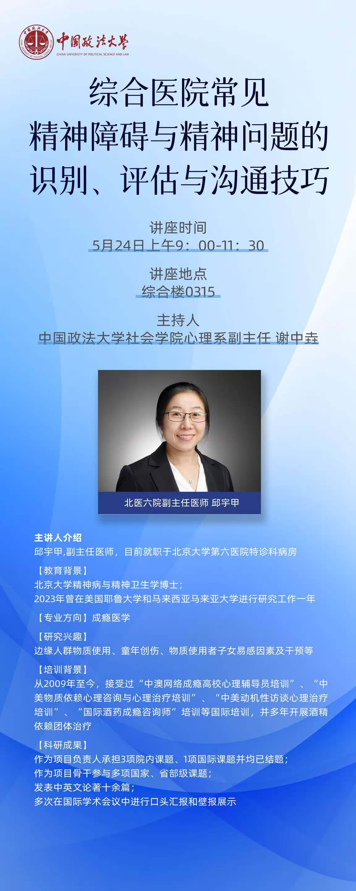 现将“综合医院常见精神障碍与精神问题的识别、评估与沟通技巧”讲座信息通知如下,欢迎感兴趣的师生积极参加: