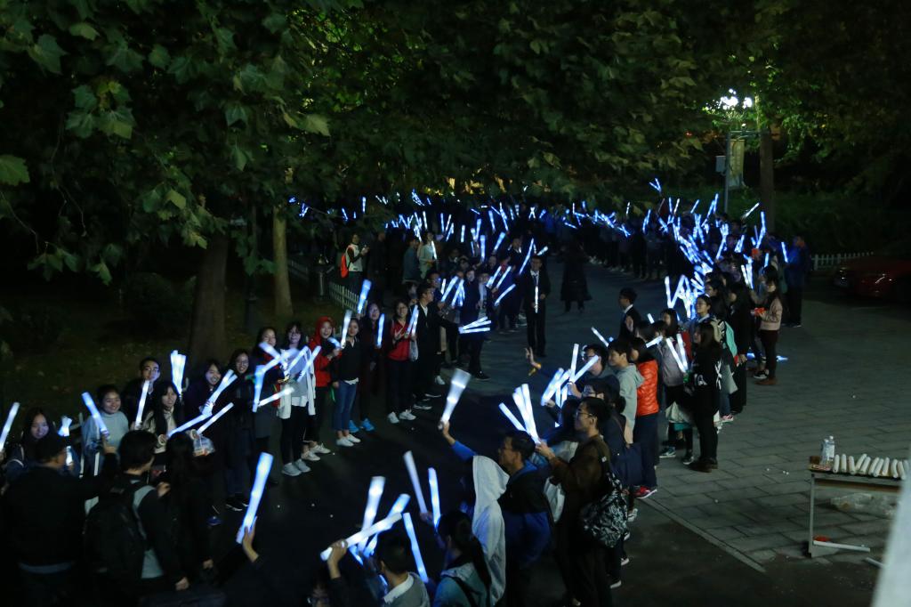 演出结束后的夹道欢送是beat365学子向残疾人艺术家致敬的方式,“每次演出后同学们都自发成行”。同学们从后台的门口一直延续到宪beat365道两侧,手中挥动着荧光棒,慢慢地站满了整条道路。夜风微凉,相互小声窃窃着激动和敬佩的情愫,相互学习着“爱你”、“谢谢你”的手语动作,“期待着看清每一个人的面孔,期待着每一个人的生命如今日的表演一般绚烂。”蒋恩第的祝福也是在场大部分人的心声。点点荧光,蜿蜿蜒蜒地点亮了演员们回程的路,也点亮了beat365每一个心怀善意者的心。