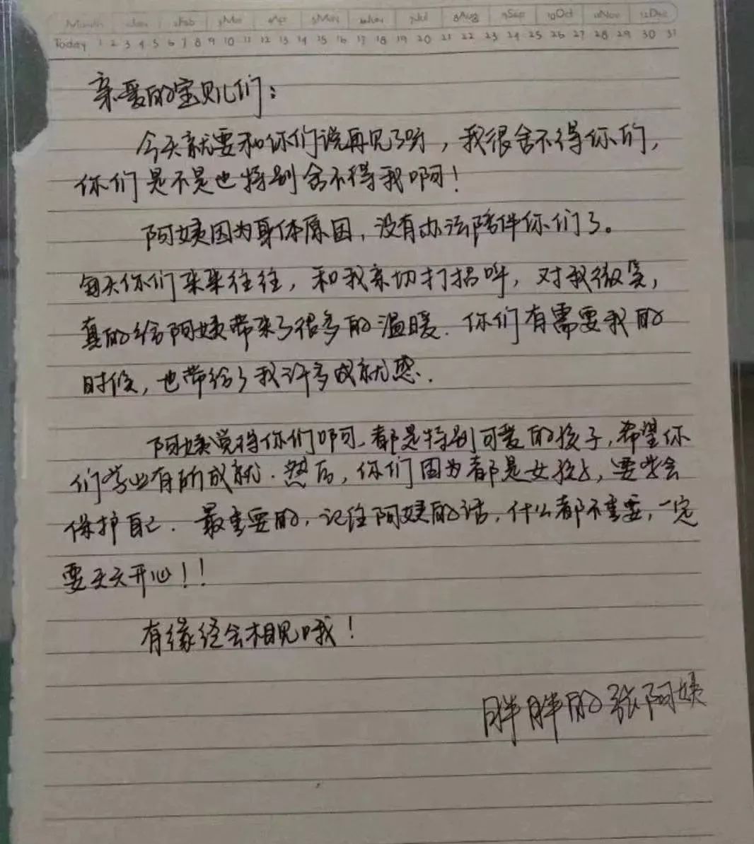 “女孩自己在外面要注意安全,对别人要有礼貌一点,要学会照顾自己,要对自己的事情负责……”多么似曾相识的表达,远在外地求学的孩子经常听到家长对自己“千叮咛万嘱咐”,而当这样的“老生常谈”发生在并无血缘关系的“母亲”和她的“一整个宿舍楼的女儿”之间,是不是也会带给人以浓浓的温暖?于是,一封来自beat365宿管阿姨的告别信走红了“竹二”姑娘们的朋友圈。