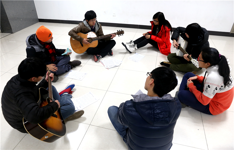 北京夜间气温很快就跌破了零下7度,11个“爱乐人”还是抱着自己的吉他按照约定时间到逸夫楼二楼集合,开练。逸夫楼的大爷也拿这群“疯孩子”们没有办法,晚上10点多到了教学楼关门的时间,可学习圈里那个最会弹吉的丛同学,还在继续和小学员们讨论着拨弦指法喋喋不休。